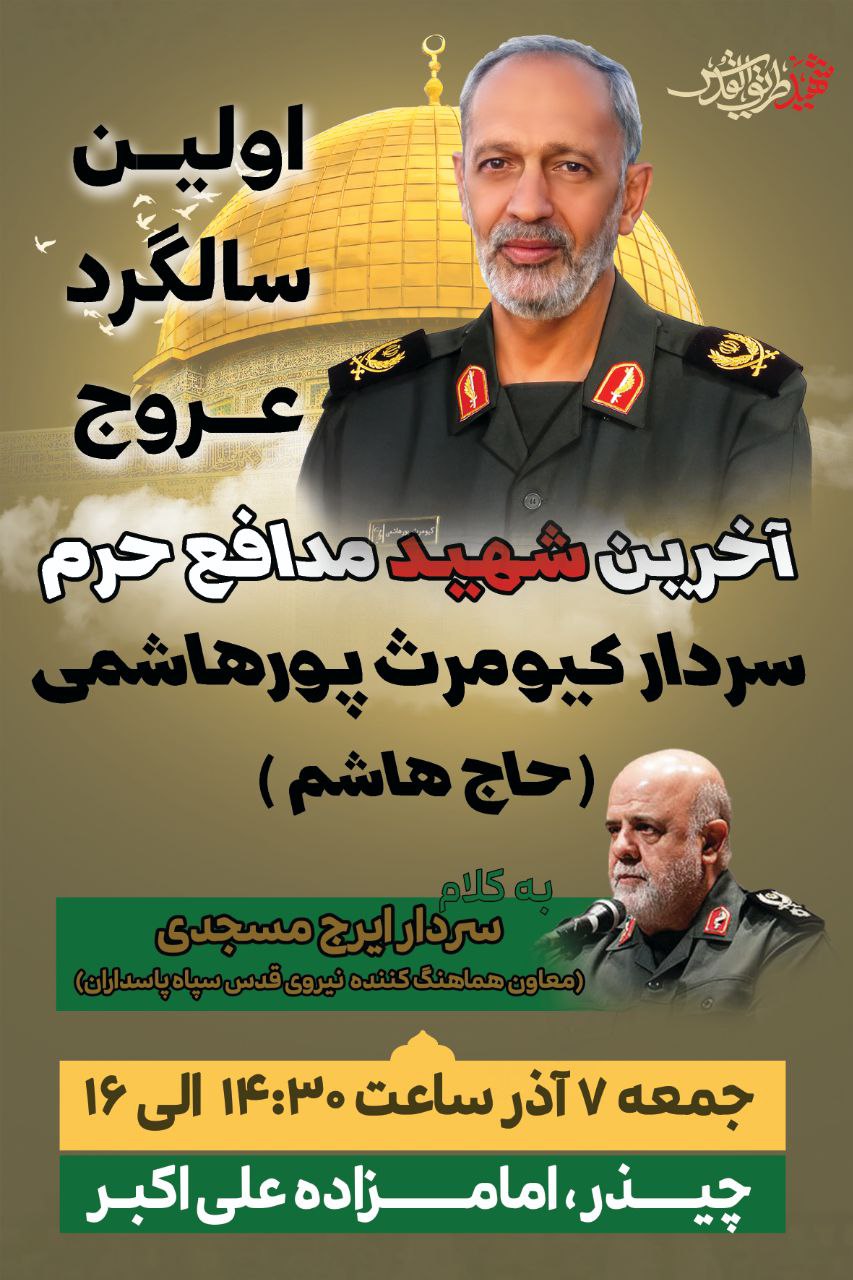 مراسم نخستین سالگرد عروج سردار کیومرث پورهاشمی، آخرین شهید مدافع حرم، با سخنرانی سردار ایرج مسجدی در چیذر و در جوار امامزاده علیاکبر برگزار میشود.